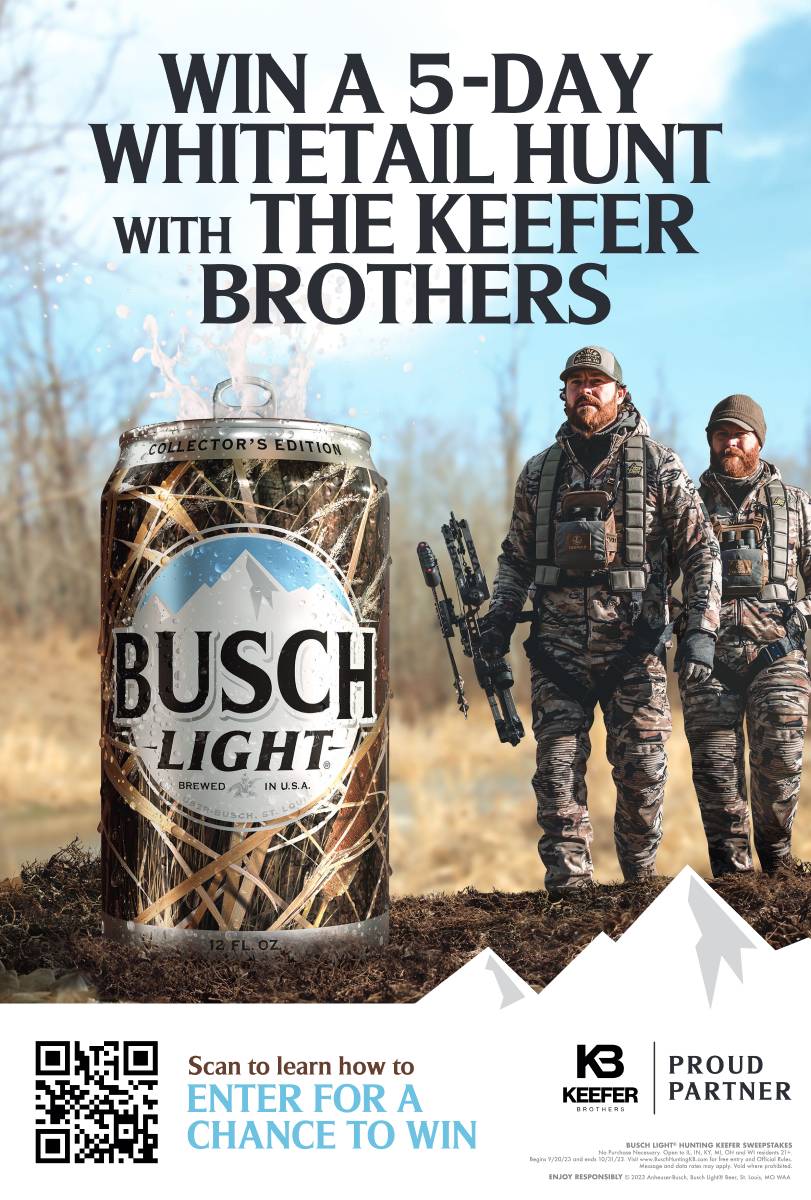 BUSCH LIGHT® HUNTING KEEFER SWEEPSTAKES OFFICIAL RULES NO PURCHASE OR PAYMENT OF ANY KIND NECESSARY TO ENTER FOR A CHANCE TO WIN. A PURCHASE OR PAYMENT OF ANY KIND WILL NOT INCREASE YOUR CHANCES OF WINNING. THE SWEEPSTAKES IS OPEN ONLY TO PERSONS WHO ARE, AT THE TIME OF ENTRY, LEGAL RESIDENTS OF IL, IN, KY, MI, OH AND WI AND AT LEAST TWENTY-ONE (21) YEARS OF AGE OR OLDER. AND WILL BE GOVERNED BY UNITED STATES LAW. VOID WHERE PROHIBITED. 1. ELIGIBILITY: The 'Bush Light Hunting Keefer Sweepstakes' ('Sweepstakes') is open to legal residents of IL, IN, KY, MI, OH and WI who are twenty-one (21) years of age or older at the time of entry. Employees, contractors, directors, officers and agents of Anheuser-Busch, LLC, and its affiliates and subsidiaries, advertising and promotion agencies, wholesale distributors, retail licensees, and all other service agencies involved with the Sweepstakes, and members of their immediate family (spouse, parent, child or sibling) are not eligible to enter or win. The Sweepstakes is subject to all applicable federal, state and local laws and regulations and is void where prohibited. Participation constitutes entrant’s full and unconditional agreement to these Official Rules and Sponsor’s and Administrator’s decisions which are final and binding in all matters related to this Sweepstakes. Winning a prize is contingent upon fulfilling all requirements as set forth herein. 2. SWEEPSTAKES PERIOD: Sweepstakes begins at 12:00:00 a.m. Easter Daylight Time ('EDT') on September 22, 2023 and ends at 11:59:59 p.m. EDT on October 31, 2023 ('Sweepstakes Period'). Administrator’s computer is the official time keeping device for this Sweepstakes. 3. HOW TO ENTER: (a) Internet: Visit www.BuschHuntingKB.com and follow the online instructions to complete and submit an online entry (also an 'Entry'). Automated Entries are prohibited, and any use of automated devices will cause disqualification. Entrants may not enter with multiple email addresses nor use any other device or artifice to enter multiple times or as multiple entrants. Any entrant who attempts to enter with multiple email addresses under multiple identities or uses any device or artifice to register multiple times will be disqualified and forfeits all prizes won, in Sponsor’s sole discretion. Multiple entrants are not permitted to share the same email address. Should multiple users of the same email account enter the Sweepstakes and a dispute thereafter arise regarding the identity of the entrant, the authorized account holder of said email account at the time of entry will be considered an entrant and must comply with these Official Rules. The authorized account subscriber is the natural person who is assigned the email address by the ISP or other organization responsible for assigning email addresses. Potential winner may be required to show proof of being the authorized account subscriber. (b) QR Code: Use your smart phone or other web-enabled device with data plan to scan the Sweepstakes quick response ('QR') code featured on signs or promotional materials at participating stores with the QR read application already installed on your phone. You will be directed to a mobile Web page at www.BuschHuntingKB.com where you may complete and submit an online entry (also an 'Entry'). Proof of scanning QR codes does not constitute proof of completion or submission of an Entry. To scan a QR code, participants must have a smart phone or other web-enabled device with a camera feature and/or QR scanner application and may incur message or data charges from their wireless service provider for each message sent and received. If you do not have a QR reader already installed on your phone, type ‘QR reader’ in your mobile device’s application store search field to find available QR readers for your smart phone or other web-enabled device. For all Entries: All Entries must be received and recorded during the Sweepstakes Period. No other forms of Entry are valid. Limit one (1) Entry per person. If entering with a mobile phone or other web-enabled device and using your wireless carrier’s network, standard data charges from your wireless carrier may apply. Check with your wireless service provider for details on these and any other applicable charges. Entrants are solely responsible for any such wireless charges. 4. SWEEPSTAKES DRAWING: Potential winners will be selected in a random drawing to be held on or about November 1, 2023, from among all eligible Entries received by Administrator, whose decisions are final in all matters relating to this Sweepstakes. Odds of winning depend on the number of eligible Entries received during the Sweepstakes Period. 5. WINNER NOTIFICATION: The prize will be awarded (time permitting). Potential winner will be notified by email or phone call and will be required to respond to the notification within forty-eight (48) hours indicating whether he/she can accept the prize. If potential winner does not respond to the notification within the forty-eight (48) hour time period, prize will be forfeited, and an alternate potential winner will be randomly selected (time permitting). Any alternate potential winner selected will also be required to respond to the notification within the time frame stated above. Potential winner will be required to complete, sign and return an affidavit of eligibility and liability and, unless prohibited by law, publicity release to Sponsor or Sponsor’s representative within three (3) days of prize acceptance. Subject to verification of eligibility and compliance with the terms of these Official Rules, including verification that the winner is twenty-one (21) years of age or older, the potential winner will be declared an official winner of the Sweepstakes. If Sponsor cannot verify that the potential winner is twenty-one (21) years of age or older prior to winner notification, the potential winner will be disqualified and an alternate potential winner will be ran
